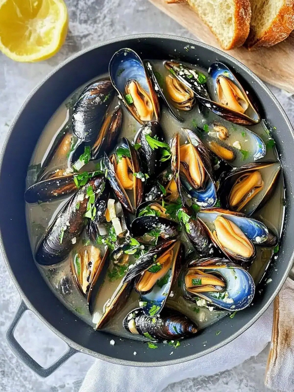 Just before serving, squeeze a small amount of fresh lemon juice over the mussels. The acidity brightens the broth and cuts through the richness, giving the dish a fresh, vibrant finish. If you’re not a fan of lemon, a splash of rice vinegar will do the trick.